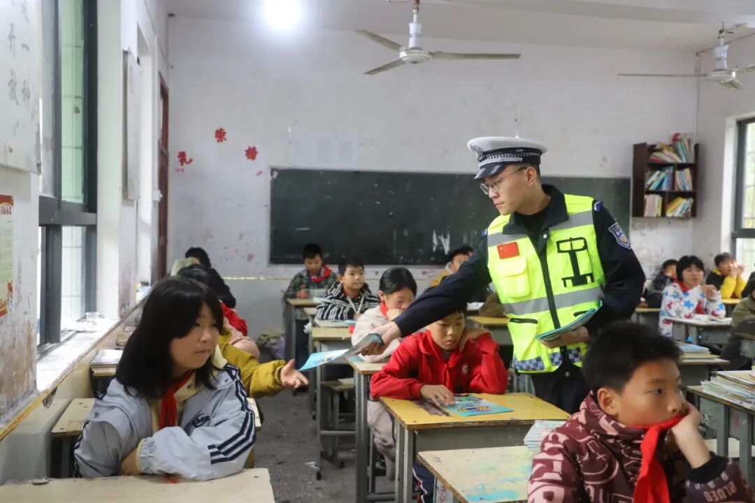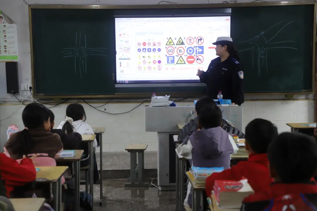 在怒溪镇完小,民警针对小学生群体的出行特点,播放了交通安全警示教育片,视频中以真实案例为切入点,生动展示了闯红灯、横穿马路、未佩戴安全头盔等交通违法行为的严重后果,引导同学们深刻认识遵守交通规则的重要性。课后,民警还更新了校园宣传栏,通过图文并茂的形式,将“一盔一带”“安全过马路”等知识融入校园日常环境,让交通安全理念潜移默化地根植于学生心中。